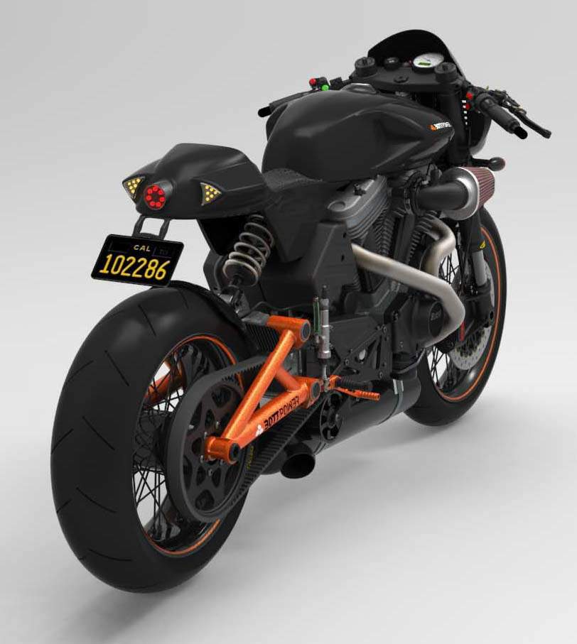 This design uses the same front oil radiator and headlamps of the BOTT XR1. In that way it would be easier to convert one bike into the other one. This version is quite far from what is common on a cafe racer.