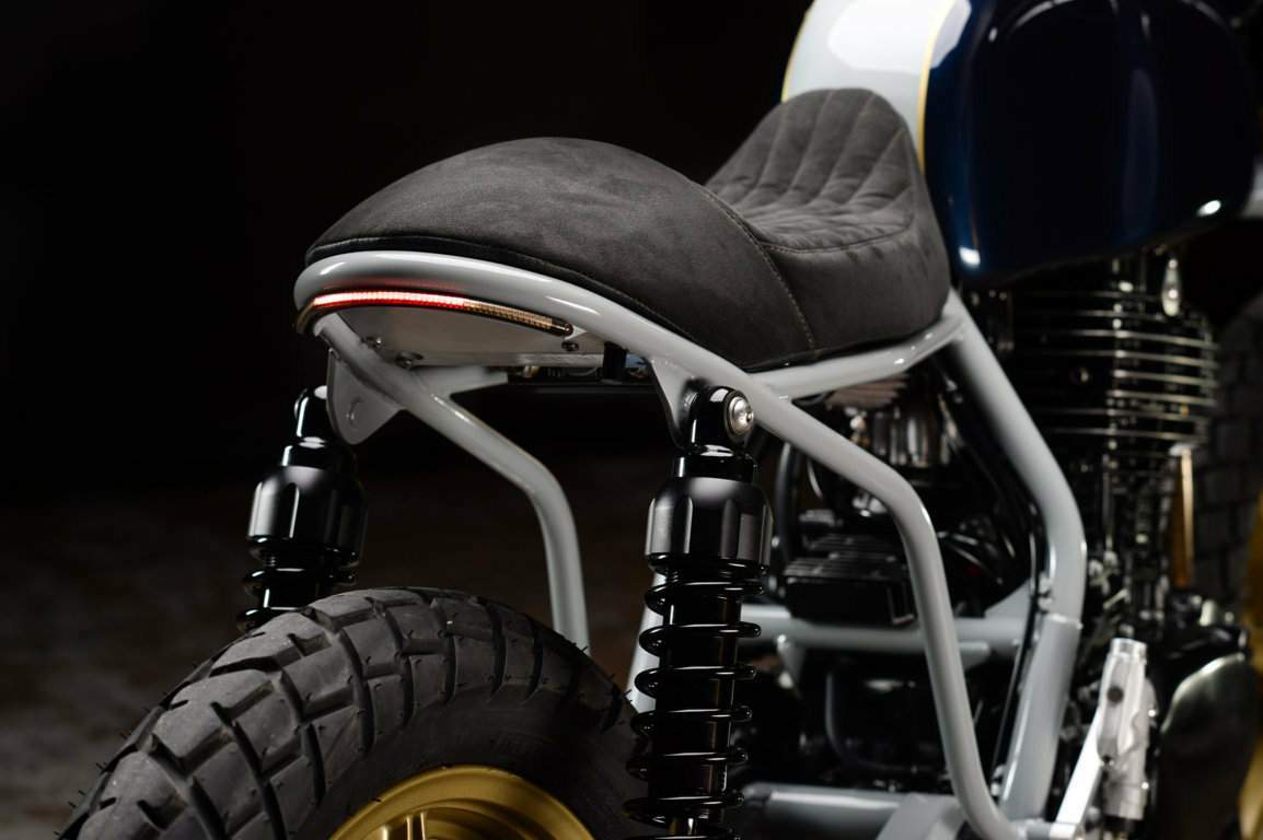 With the rolling chassis sorted out, a Benelli Wards Riverside fuel tank was heavily modified to fit over the frame and engine providing very smooth curves and shapes without being forced to build a full custom tank. A hand formed alloy seat pan was fabricated and then wrapped in a black leather all done in-house at Revival Cycles. For Color choices, Revival went with a Porsche Cayan blue with metallic gold pinstriping the tank, and Geyser Grey was used on the frame, suspension and fuel tank. With a final wet weight of 289 pounds, modern suspension, brakes and a very neutral riding position this bike is a blast to ride and sounds tough as nails. The entire project proves that a budget custom can still be subtlety complex and still appear simple. Nothing simple here though.Source Revival Cycles