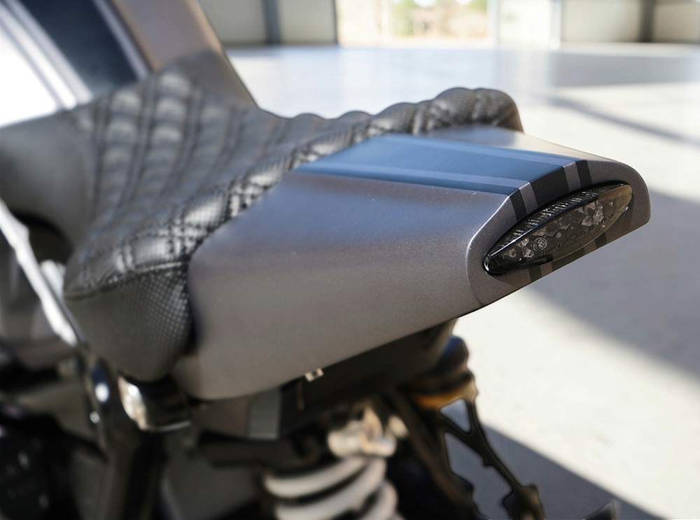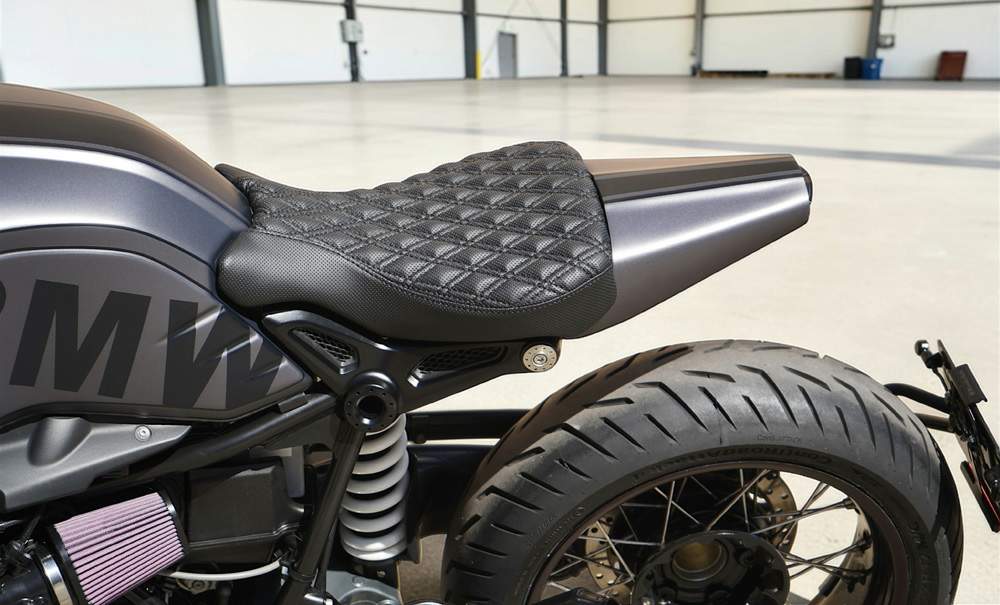 At the front, the modified front fender stands out, along with striking oval LED headlights that modernize the look without losing its classic character. The use of clip-on handlebars reinforces its sporty riding position, while the modified suspension improves both dynamic handling and overall aesthetics. The engine breathes through high-performance air filters and a custom exhaust, providing not only functional improvements but also a more aggressive visual touch. At the rear, the design is completed with a side-mounted license plate holder, a clean and elegant solution that leaves the rear wheel completely unobstructed. The electronics have also been meticulously refined, incorporating Motogadget components, such as the speedometer and turn signals, which offer technology, precision, and a premium finish. As for the finish, this customized NINE T "RR" boasts a spectacular combination of graphite gray and matte black paint, enhancing its understated and sophisticated character. The bespoke upholstery, designed specifically for this model, adds the final touch of exclusivity and comfort.
