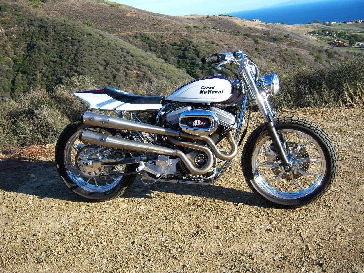 This street legal flat tracker the Grand National Replica 1st Edition with full of state-of-the-art components weighs in at only 380 lbs. it has a 1200 105 hp Buell XB motor Former Grand National racer Bill Hofmeister is the man behind the machine. Features 1200 Buell XB Motor with 105 HP Image by Darrell Eager. Grandnationalreplica.com.