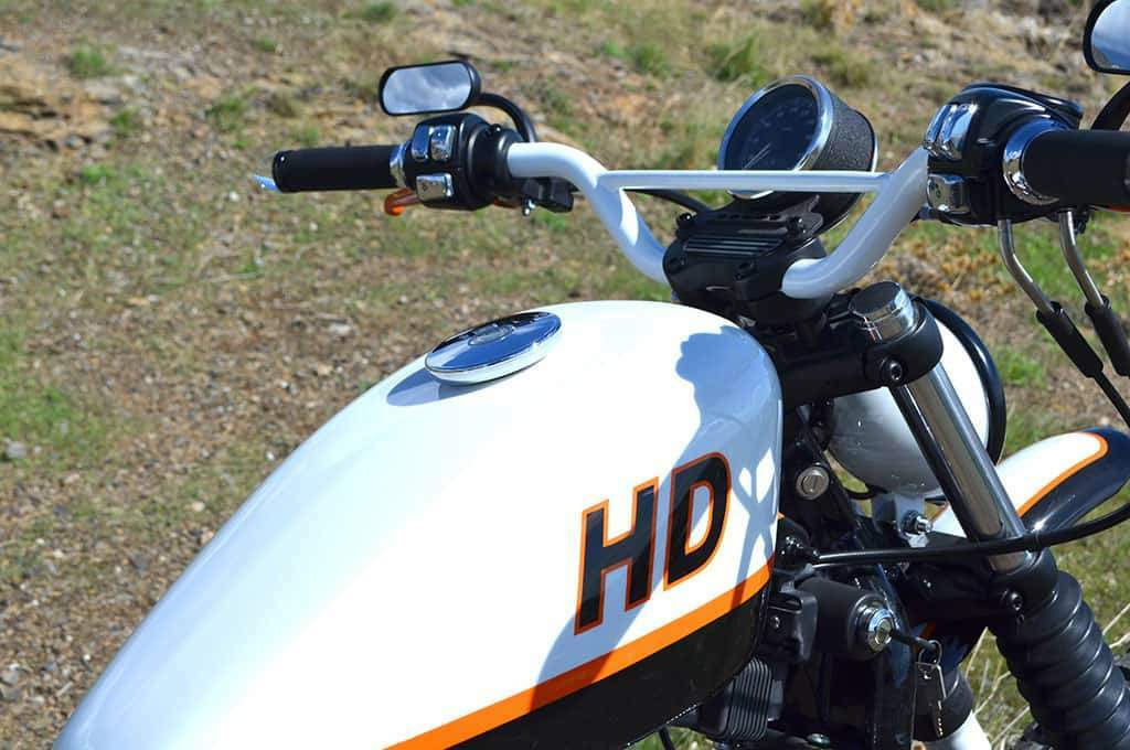 THE CREATION PROCESS OF THIS HARLEY SCRAMBLER “SPORTRACKER”...The chosen base is a 2005 carburetted Sportster. It started using very simple rims, with 40 spokes in gloss black and kept the odometer on the handlebars like the older bikes, without any digital elements like in the previous Scrambler. All the graphic design and painting and airbrushing work on this bike is as simple as it gets. The colours (white, black and orange details) were chosen by his eldest son (born in 2005) and hence the number "05" on the side plates. The rear fender as well as the front fender and the side number holders are the work of Lord Drake Kustoms.