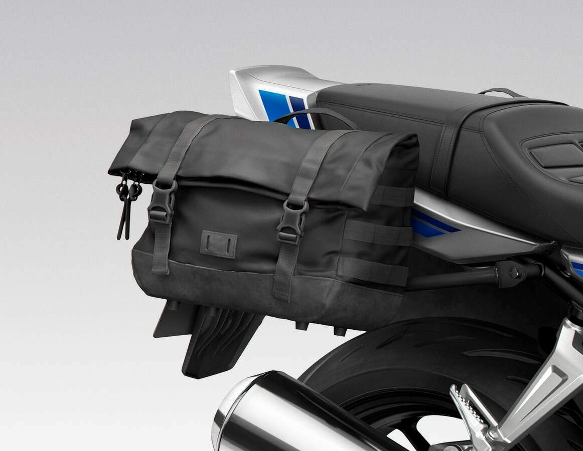 Chassis The CB1000 Hornet has been acclaimed for its light, easy handling and that ability starts with the frame which the CB1000F also employs. The one-piece steel diamond-style twin-spar unit is designed around the engine and uses an F-specific rear subframe, opening room for more comfortable two-up riding. In addition, a centre stand can also be fitted, easing chain maintenance. Rake and trail are set at 25° and 98mm, with wheelbase of 1,455mm. Kerb weight is set at 214kg. The riding position is relaxed, and upright for stress-free riding and good visibility in town. A 2.8m minimum turning radius – alongside the easy-handling geometry – ensures light urban manoeuvrability. The seat uses thick cushioning with seat height set at 795mm; the bike’s narrow mid-section makes for easy ground reach. Ground clearance is 135mm. Up front, Showa 41mm Separate Function Fork Big Piston (SFF-BP) USD forks are adjustable for spring preload and rebound/compression damping – allowing owners to tailor to their preferences. The new single tube separate-pressurisation Showa rear shock operates through Pro-Link – with a new linkage that offers ride comfort at lower, around-town speeds and more stability as velocity increases – and adjusts for preload via cam; rebound damping is adjustable. The asymmetrical cast aluminium swingarm minimises muffler clearance for improved lean angle and moves its mass closer to the centre of gravity. It also offers an optimum rigidity balance for sportier riding on twisting mountain roads. Dual, radial-mount Nissin four-piston calipers grip 310mm floating discs. To match the suspension settings – and create an easy-to-handle machine – the brake hose expansion rates have been revised (along with other detail changes) to create reassuring brake performance and feel. Cornering ABS, managed by the six-axis IMU, adds extra peace of mind for the rider. The rear 240mm disc employs a Nissin single-piston caliper. The 5Y-spoke design wheels (originally drawn from the concept of the CBR1000RR-R Fireblade) are cast in lightweight aluminium. Tyres are sized 120/70-ZR17 front and 180/55-ZR17 rear. Accessories Sports Pack Comfort Pack Travel Pack As well as a wide range of options available individually: