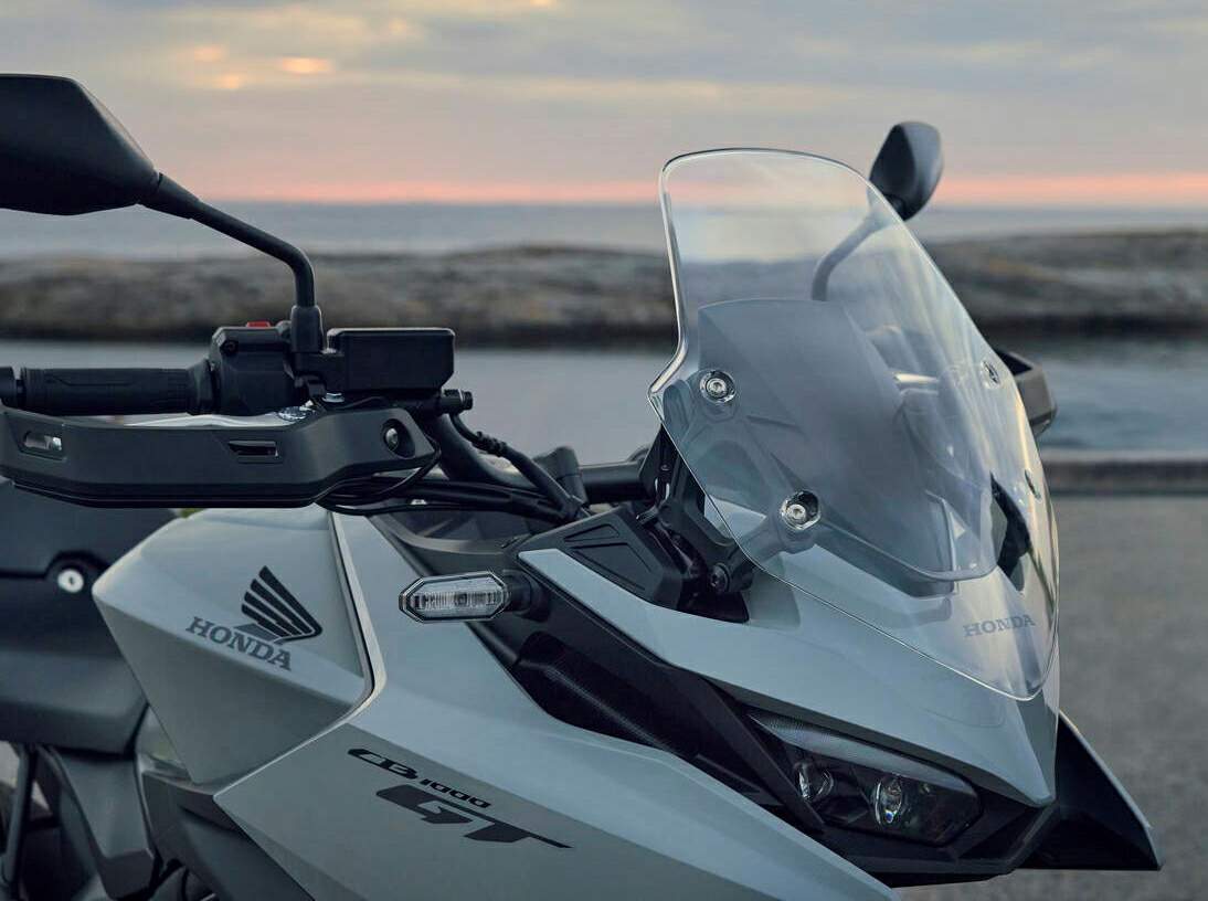 Styling & Equipment A product of collaboration between Honda’s styling studios in Italy and Japan, the bodywork of the CB1000GT is made up of sharply cut surfaces, outlining an aggressive riding character led by the piercing dual projector headlights. By positioning the bodywork above the chassis, starting from shroud tips integrated with the front cowl, the perception is of a high, mass-forward centre of gravity with fast steering performance. But it’s not just about style. Brought to reality using Computational Fluid Dynamics (CFD) the front fairing achieves maximum wind protection with neutral handling characteristics, through every pitch/ roll/ yaw riding situation. The five-position screen – operated by one hand – adjusts through a total range of 81mm. Set low, it gives a sense of freedom. Set high it provides comfortable wind protection. The Tall Screen accessory option provides increased deflection around the seat, including for the pillion. Standard detachable 37L left and 28L right panniers offer convenient carrying capacity, whilst standard heated grips ensure year round comfort. In alignment with Honda’s long term environmental goals (Triple Action to Zero) the GT’s standard screen is made of DurabioTM, a plant-based biomass, while the front and rear seat base plates use pre-consumer recycled PP (polypropylene). All lighting is long-life, energy-efficient LEDs. Cruise control, with an