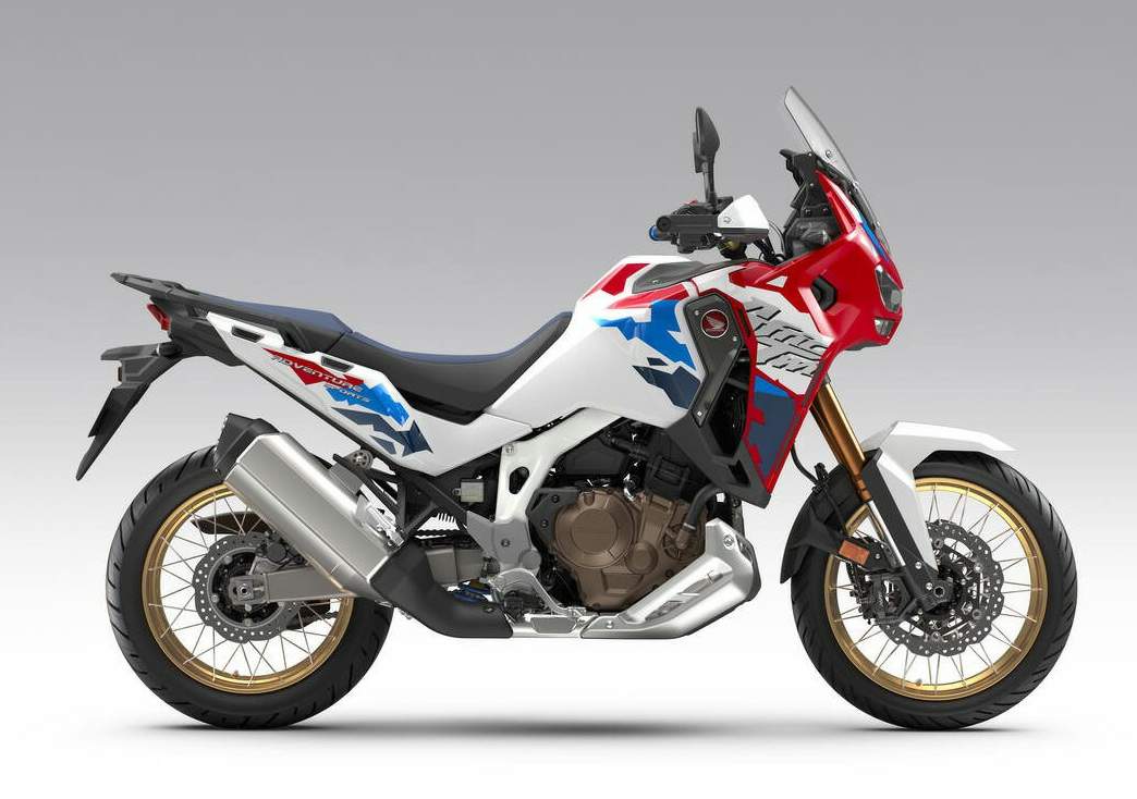 stability. Up front, compact two-piece radial-mount four-piston calipers work dual 310mm ‘wavy’ floating discs through sintered pads. The rear 256mm ‘wavy’ disc features hole punching and shaping for optimal rear wheel control. 19-inch front and 18-inch rear (stainless steel) spoked wheels wear 110/80R19M/C 59V and 150/70-R18M/C 70H tubeless tyres, which allow for easier repairs without the need to remove the wheel, provide increased front-end grip, improved response and rider feedback, plus high-speed comfort and increased stability under braking. Bridgestone Battlax Adventure A41 are approved as OEM tyres. Block pattern tyres (Michelin Anakee Wild 110/80R19M/C 59R TL and 150/70 18M/C 70R TL) are also approved for fitment. Engine - Peak power of 75kW With the 24YM updates concentrating on increasing torque in the most-used low, mid and upper mid-range, the 1,084cc, 8-valve parallel-twin engine produces 75kW @ 7,500rpm with peak torque of 112Nm @5,500rpm. Bore is set at 92mm with 81.5mm stroke and compression ratio of 10.5:1. 35mm airbox intake ducts draw air to twin, length-optimised internal trumpets. 46mm throttle bodies feed the inlet ports and the bore and cylinder pitches are aligned to create a smooth air intake profile. The injector angle delivers a direct spray into the twin-spark combustion chambers. Honda’s SOHC Unicam valve train is a feature of the MX competition-specification CRF450R, and the low-set position of the cast camshaft contributes to the compact nature of the cylinder head and entire engine package; inlet valves are 36.5mm in diameter, exhaust valves 31.0mm, with 10.1mm and 9.3mm lift respectively. The 24YM updates saw the introduction of a reshape of the 270° crankshaft, reshaped and reinforced conrod and 0.4mm longer piston, which also featured a reshaped piston surface crown for optimal ignition and engine performance. Aluminium cylinder sleeves save weight while the 270° phased crankshaft and uneven firing interval create the engine’s desirable signature ‘throb’ and character. The crankcases are split horizontally; the water pump is housed efficiently within the clutch casing with a thermostat integrated into the cylinder head. Manual and DCT versions of the engine share common crankcases with only minor external differences; the water and oil pumps are both driven by the engine’s balancer shafts. The engine features a semi-dry sump design with in-tank lower crankcase oil storage. This allows a lower pan depth that keeps overall engine height low. As the pressure-fed pump is located within the tank where it delivers its oil from, there is no need for a pressure-feed passage. Secondary vibrations are neutralised by the mutually reciprocating motion of the pistons, while primary inertial and coupling vibrations are cancelled by the use of biaxial balance shafts. The aluminium clutch centre and pressure plate use ‘assist’ cams to ease upshifts and ‘slipper’ cams for deceleration and downshifting. The six-speed manual gearbox uses the same shift-cam design as found on the CRF450R to ensure positive changes. The exhaust muffler was also updated for 24YM with increased lower pipe diameter, and revised internal structure, delivers enhanced engine performance in the low and mid-range and gives a pleasing exhaust ‘pulse’ at lower rpm, and more ‘bass-fuelled’ note at high-rpm.