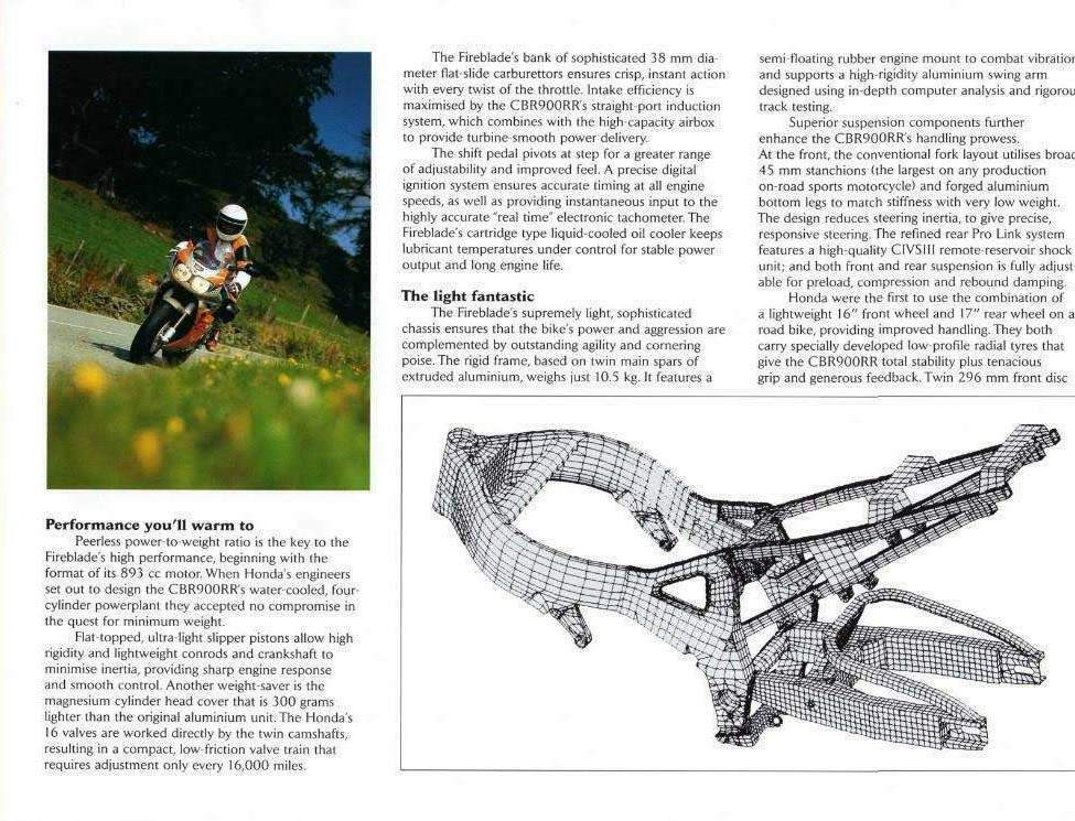 Roll the 900 onto the scale and its weight advantage over the competition is instantly clear. Suzuki's GSXR1100 pioneered the low-mass open-class approach in 1986, though it has ballooned to 571 pounds in new-for-'93 liquid-cooled trim; that's 114 pounds more than the CBR. Yamaha's 533-pound FZR1000 pushes the needle on our scales 76 pounds farther than the Honda. And a fully fueled ZX-11 Kawasaki is a shocking 144 pounds porkier. But simply making it light wasn't enough. Honda engineers wanted to move as much weight as possible away from the extremities of the motorcycle to sharpen its reactions even further. The process is called mass centralization, a bit of physics Honda has been using quietly for years, though never so meticulously as on the RR. Flip back to "The Mass-Centralization Solution" in our May '92 issue if you missed the full story. In a nutshell, everything a rider asks the machine to do becomes easier as the heavier bits migrate toward the center of the machine. If a part couldn't be positioned ideally during development, it was made as light as possible. The tiny 8 amp-hour battery, plastic headlight lenses and aluminum muffler canister are perfect examples of this.