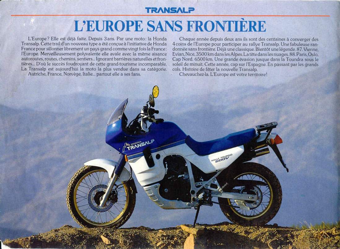Much is made in Honda's promotional blurb of the Transalp being a new concept in motorcycle design, and the term Rally Touring even ends up on the Transalp's side panels. Despite Honda's claims, the concept of a Rally Tourer (by which I suppose they mean a triple-purpose bike - street, trail and tourer) is far from new. The Italians and French have been converting big trailers into rally tourers for some years now, although it was BMW who really started it all off with the R80GS back in 1981. (Some would argue that BSA were the first with the Firebird, but basically all that was was a lightly modified A65 Thunderbolt so it doesn't count.)