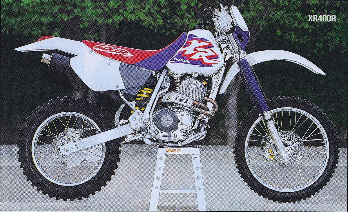 Suspending the XR up front is a fat 43mm catridge fork with 11 inches of front wheel travel. Honda claims the unit is very similar in construction to the fork design used on their CBR900RR street bike. With 18-position compression damping and 12-position rebound damping, the forks can be set up for a variety of situations. Neatly tucked under the seat are the "brains" of the rear suspension. A Showa shock featuring standard spring preload adjustment, as well as 16 position compression and rebound damping adjustability, offers 11.8 inches of rear wheel travel. Preaching the religion of short wheelbases, the XR400 spans 56.1 inches, just one inch longer than the new XR250R, and .20 inches shorter than the original XR350. Fork rake is 25 degrees 15 minutes (XR250R is 24 degrees 54 minutes), with a trail of 94mm, (XR250R is 92mm). The XR350 of yesteryear had 116mm of trail. The XR shined in sand washes and fast one-track roads. Subtle bumps and well groomed jumps were not a problem. The Honda torqued its way through the rocks and loose gravel without a hitch. On the motocross track the XR held its own - if only we could've held on. Severe drop-offs were more of a challenge and, while the bike never bottomed out, we were wishing we hadn't visited the all-you-can-eat breakfast buffet that morning. Details Bodywork is sleek, easy to remove, and of high quality. All controls are well laid out. Overall the ergonomics of the bike feel pretty good. The seat is comfy and slim, as is the tank. We would opt for a bit less padding if asked. The engine's counterbalancing system does a great job of reducing vibration to the handlebars, thereby reducing potential rider fatigue. The exhaust system is all new, featuring a spark arrestor and removable baffle. We ran our XR with the baffle and airbox restrictor removed. The new combination of chassis and suspension are pure bliss resulting in a bike that turns relatively quick, yet can tackle the straight stuff with confidence. Very aggressive riders will want to go through the regular routine of swapping springs and revalving, but they'll be starting with a terrific platform that suits the masses and then some. Box stock, the Honda is the closest you're going to get to a race ready 4-stroke for the price. Source Motorcycle.com