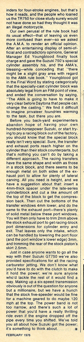 The Suzuki TR750 was a racing motorcycle, which was developed for Formula 750 racing. The machine was first raced at the 1972 Daytona 200. Barry Sheene won the 1973 season and was runner-up in 1975. The motorcycle, designated XR 11 within the group, was developed from the Suzuki GT750 road model, but none of the components were interchangeable. The performance-enhanced water-cooled in-line three-cylinder two-stroke engine had contactless thyristor magneto ignition and fuel was delivered via three 32 mm Mikuni carburettors. As with the production model, lubrication was carried out using fresh oil, the Suzuki CCI system (Crankshaft Cylinder Injection). The power was transferred to the rear wheel via a dry clutch and a five-speed gearbox. The usable speed range ranged from 6000 to 7500 rpm, the maximum torque (93 Nm) was reached at 7000 rpm. The double-loop tubular frame from the series had been lightened in order to reduce weight. Dunlop race tires, 3.25–18 at the front and 3.50–18 at the rear, were fitted. The chassis did not do justice to the "brute" performance. When it debuted, the Suzuki TR 750 was nicknamed the "Flexi-Flyer". "The catastrophic driving characteristics of the fastest racing machine of its time resulted from an unfavourable weight distribution in connection with a high centre of gravity." "The TR 750 had such a bad reputation as racing machines. Only the brilliance of a Barry Sheene brought the XR 11 victories - nevertheless, the Flexi-Flyer is remembered as the first large two-stroke racing machine of modern times.