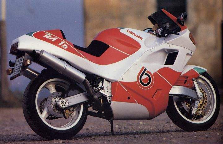 The second version of the Tesi was actually presented only a few weeks after the first. The only modification was engine displacement which was increased from 851 to 904. It was absolutely identical to the 1D 851 and was later to become known as the "SR". This was to cause confusion as the later "SR", which was different in both appearance and chassis. The Bimota Tesi is one of the most radical, m extraordinary and most interesting superbikes ever built. With the Tesi, the small Italian factory took a giant leap forward in motorcycle design, one that only Yamaha (and to a lesser extent BMW) have dared to follow, although 'specials' builders such as Nico Bakker have produced similar machines in very' small numbers. What Bimota did was put into production a superbike that featured hub-centre steering rather than traditional telescopic front forks. The problem with conventional telescopic forks is that they flex under braking and cornering, and because they compress under braking, the steering geometry of the bike is altered. In an ideal world the suspension and steering of a motorcycle should be separate and independent to each other. With telescopic forks this isn't possible, no matter how good the forks are, but with hub-centre steering the suspension can be separated from the steering. So instead of wrapping the motorcycle's engine in a conventional frame and then bolting a pair of forks to the headstock and a rear swingarm to the back, Bimota have wrapped their chassis around the sides of the engine and then bolted a swingarm on at the front and at the back. The rear swingarm pivots in the traditional way and actuates the rear shock, while the front shock is bolted to the left-hand spar of the front swingarm and to the chassis. A complicated system of linkages joins the steering column to the front wheel to allow almost 30 degrees of steering movement. One of the advantages of using a twin-sided front swingarm (as opposed to a single-sided one like the Yamaha GTS 1000) is that it allows two brake discs to be used. And with twin 320mm front discs gripped by four-piston Brembo calipers, the Tesi has one of the best brake set-ups of any superbike.