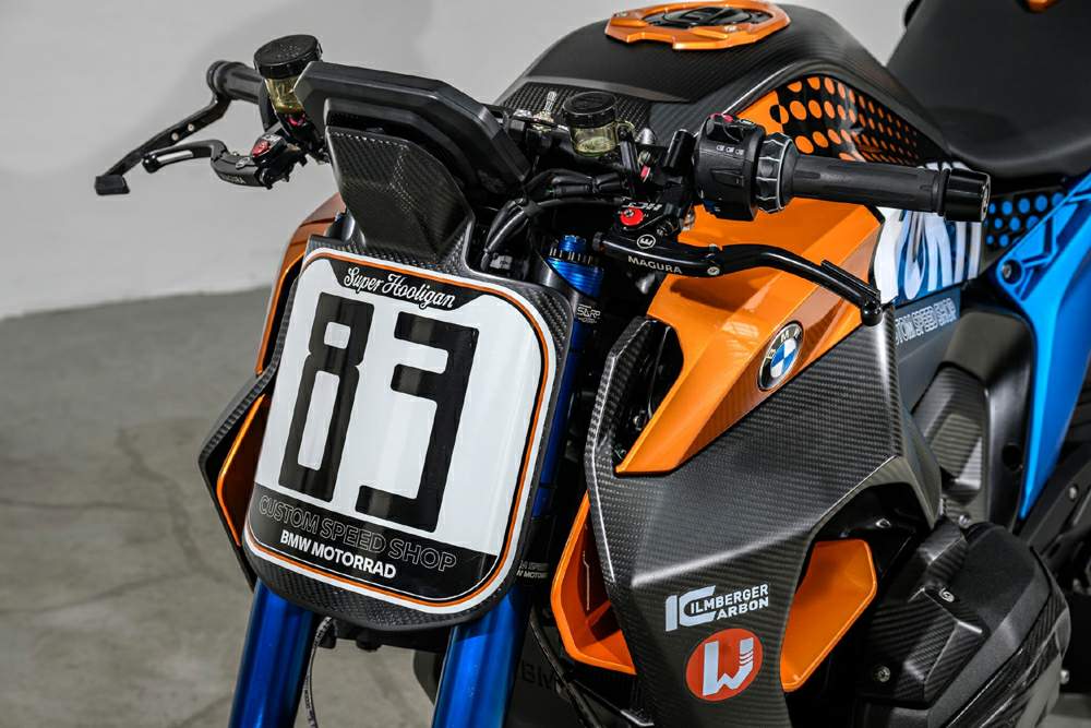 The high riding dynamics requirements of the Custom Roadster – capable of reaching speeds of up to 275 km/h and delivering a superbike-level riding experience - are achieved through the lightweight, handling-enhancing BMW M 1000 RR carbon front wheel and a wide range of lightweight yet high-strength carbon-fiber components from both the BMW Motorrad program and Ilmberger Carbon Parts. Fully adjustable hand levers from Advik, a lightweight and sonorous titanium exhaust system with carbon end silencer from Akrapovič, and milled BMW Motorrad footrests complete the supersport-focused Custom Roadster project. The BMW R 1300 R Superhooligan will be showcased alongside its