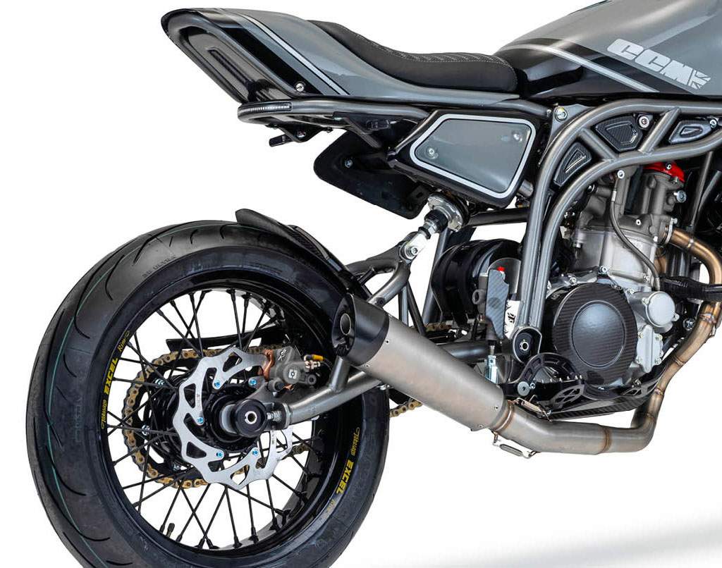 The Street Moto sports a pair of 17” rims giving this new machine a playful air, the bike appearing to beg you to take it to the nearest sinuous B-road, where this bike truly excels. Bike shown includes optional Carbon Pack, Brembo Twin Disk Kit, CNC Foot Controls, CNC Sprocket Guard, CNC Oil Cap. Key Features: - 17" Black laced Haan Wheels