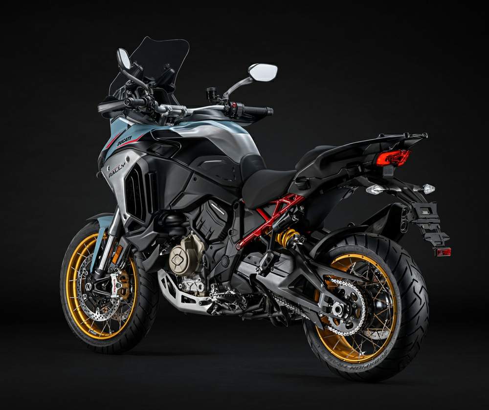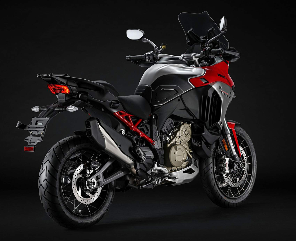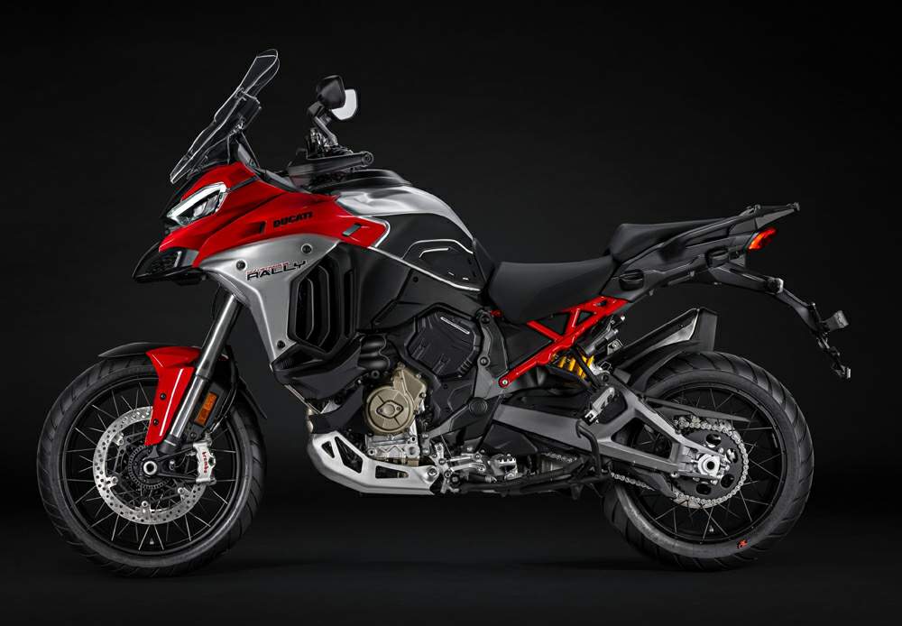 Engine and chassis In terms of chassis, the Multistrada V4 Rally maintains its lightweight and compact aluminium monocoque frame, with a double-sided shell-cast aluminium swingarm mounted on a repositioned, higher-mounted pivot, increasing the suspension's anti-squat effect for more precise and effective handling even under full load. For the same purpose, the braking system has been upgraded with a larger 280 mm rear brake disc. The Multistrada V4 Rally is offered exclusively with lightweight, tubeless spoked wheels that contribute to improving the bike's dynamic performance. They are equipped as standard with a TPMS sensor that displays tyre pressure on the dashboard.