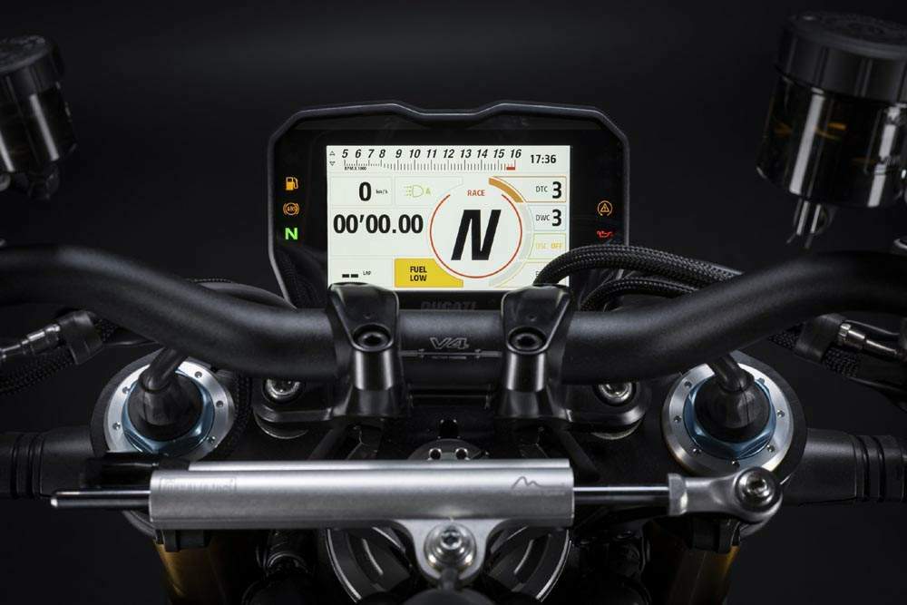 Electronics The new Streetfighter V4 implements the Power Modes logic already developed in the Ducati Panigale V4 and V4 S with calibrations dedicated to the Desmosedici Stradale engine in the Streetfighter configuration. There are four engine delivery strategies: Full, High, Medium, Low. Full and Low are newly devised, while High and Medium have been revised in strategy. Full Power Mode allows the engine to express its full potential with torque curves without electronic filters, except for first gear. For the High and Medium Power Modes, a new Ride by Wire map management system has been developed with dedicated calibration for each of the six gears, which ensures the rider always obtains the optimum thrust every time the throttle is opened. The Low Power Mode, on the other hand, has been designed for riding on low-grip surfaces, limiting the maximum power of the bike to 165 hp and offering a particularly manageable throttle response. The calibrations dedicated to the Streetfighter V4 guarantee maximum correlation between the torque value required by the rider and that actually delivered. The Streetfighter V4 in the 2023 version sees the introduction of the brand-new Wet Riding Mode to make riding even safer on low-grip surfaces. The standard equipment is enriched by a lithium-ion battery for the S version (1.7 kg lighter than the previous one and already equipped on the V4 SP version). The dashboard of the new Streetfighter V4 also follows the evolution traced by the Panigale V4. The graphics are revised in all views, to make the information simpler and more descriptive and support in the calibration of the various parameters. As on the Panigale V4, the gear change is indicated via an external green LED signal. The dashboard offers the “Track Evo” display mode, which replicates the layout used on the MotoGP Desmosedici and guarantees an immediate view of the most important information and the intervention of the electronic controls. The Streetfighter V4 2023 also evolves thanks to the new Engine Brake Control (EBC) EVO 2 software which guarantees better stability, precision and directionality in the braking and corner entry phases and the possibility for the rider to define more precisely the electronic setup for each use. This software features a different gear-by-gear calibration on each of the three selectable levels. The new strategy was developed to optimize the intensity of the engine brake as a function of the load on the rear end. In the first braking phase, when there is little load on the rear tyre, the EBC EVO 2 provides less engine brake, then increasing it as you approach the centre of the corner, where the intervention of the engine brake makes the greatest contribution in slowing down the bike and closing the line. Thanks to this modification, which guarantees a more balanced intervention of the control on the engine brake in all riding conditions, the locking of the rear wheel in the most demanding braking sections is also reduced.