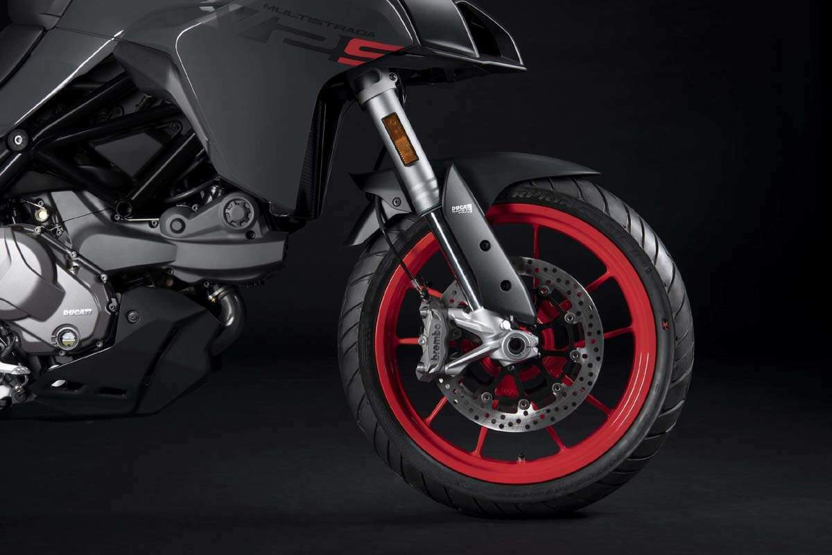 The riding position is now more comfortable with the new footpegs inherited from the Multistrada V4 which, thanks to a 10 mm increase in distance from the seat, ensure the right amount of room also for taller riders, preventing them from bending their legs excessively, and thus allowing a more restful position during long journeys. Another key area of improvement is the reduction in the bike’s weight, which, through work on many elements, has resulted in a reduction of 5 kg in weight compared to the Multistrada 950. The engine update has produced a saving of about 2 kg, including the clutch (1.5 kg) and its cover, gearbox drum and connecting rods. Various parts of the vehicle have been lightened, including the mirrors, derived from Multistrada V4, the front brake disc flanges and the rims: the new Multistrada V2 mounts rims derived from the Multistrada V4, which are about 1.7 kg lighter, thus generating an important improvement in the dynamic behaviour of the vehicle. Spoked wheels are also available in the Ducati Performance catalogue, which have been significantly lightened.