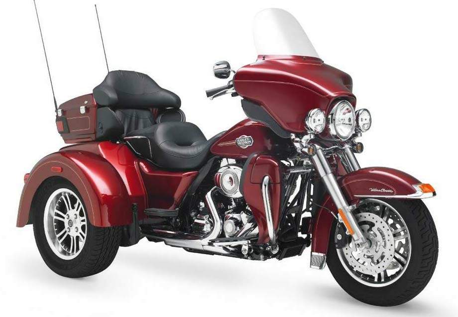 basically a trike version of the two-wheeled Ultra Classic tourer. Harley-Davidson has designed a new rear-axle assembly for the Tri Glide that utilizes an aluminium centre section with steel axle tubes. The Tri Glide retains the high-strength and low-maintenance advantages of belt final drive, and the smooth operation of a rubber-cushioned, compensated rear drive. The rear suspension features dual air-adjustable rear shock absorbers. The Tri Glide is powered by a Twin Cam 103 V-Twin engine with Electronic Sequential Port Fuel Injection (ESPFI), rated at 101 ft. lbs. of torque. It retains the 6-speed Cruise Drive transmission used on Harley-Davidson Touring motorcycles, but adds an optional electric reverse ($1,195) integrated with the rear differential assembly that is engaged with a handlebar-mounted reverse module. The Tri Glide has dual front disc brakes and a Hayes Brake dual-disc rear brake system with a lever-actuated, integrated park brake. Classic Harley-Davidson Styling The Harley-Davidson styling department gave the new body components of the Tri Glide clean lines that integrate with the existing Ultra bodywork, especially the Tour Pak luggage compartment and the passenger seating area. The new bodywork is painted with the same quality OEM paint and process used on all Harley-Davidson motorcycles, and is a perfect colour match for the tank and front fender. The composite rear fenders complement the lines of the front fender. Because the rear fenders are each a separate piece from the rest of the rear bodywork, they can be removed individually for repair or replacement, or when required to service the Tri Glide.