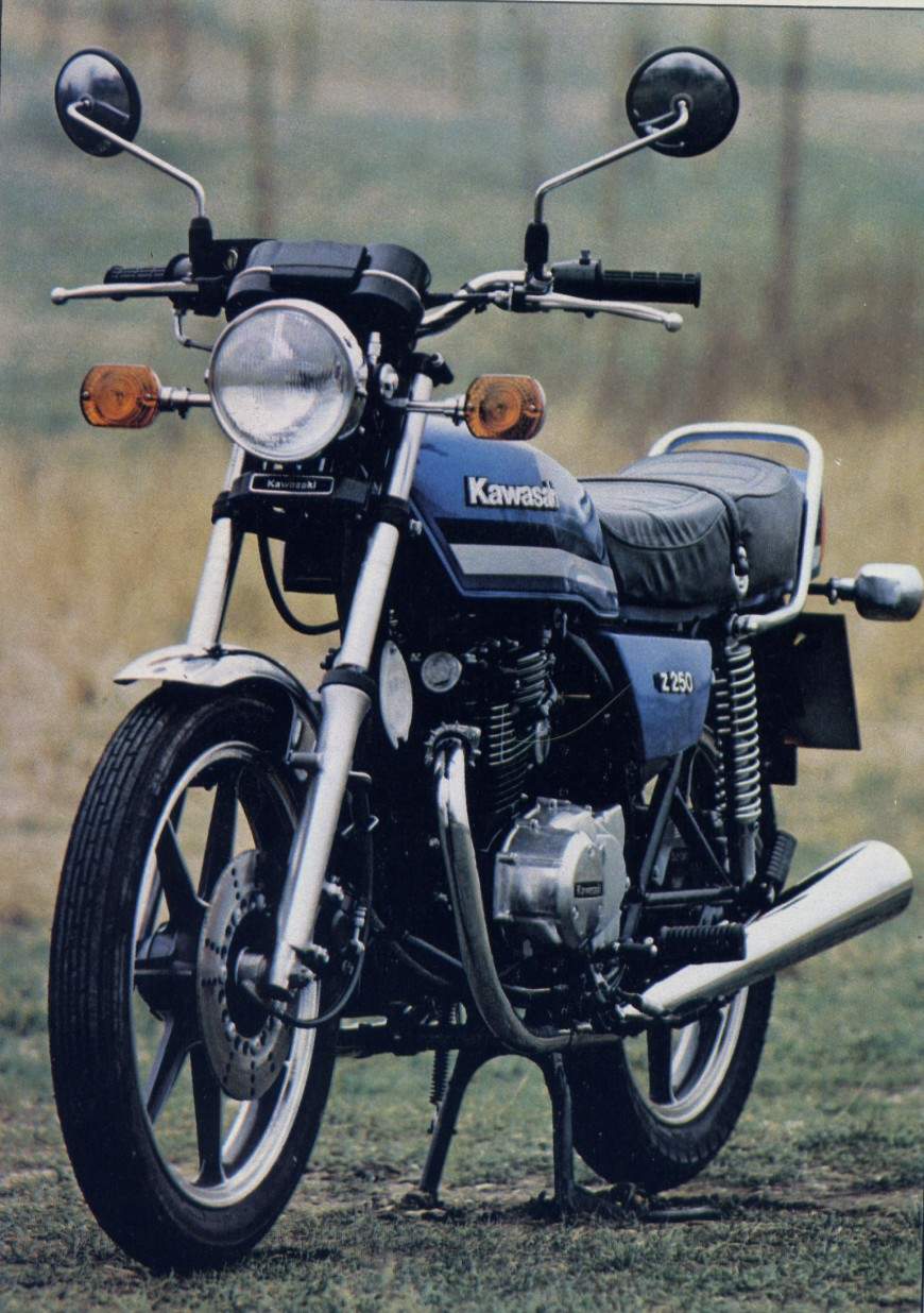 height seems excessive it's because there's more padding in the seat. The Japanese Dunlop tyres give good road-holding, too, and you can take advantage of the cornering clearance enough to prevent scraping of the undercarriage. Riding position was excellent and the slim lines of the Kawa made for an easy-to-handle mount in all traffic conditions, though the slightly long stretch when sitting up to the flat bars did slightly favour the taller riders. Though the fashion in rear brakes is back to drums, the Z250A3 still uses a disc. That's because it's rightfully smaller than the front 9in unit and likewise has metallic pads and perforations for good feel and power when wet or dry. As on many of the later Kawasakis the front disc and wheel assembly is lighter because there's now no carrier for the disc rotor.