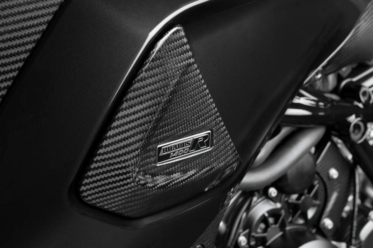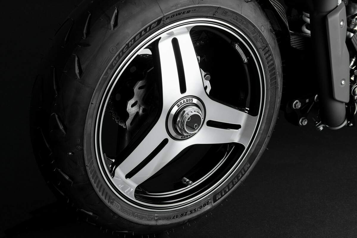 The same high-grade microfiber used to enhance the fuel tank also came into play throughout the development of the premium upholstery. The BRABUS designers meticulously hand-crafted a bespoke rider’s seat from a brand-typical combination of BRABUS MASTERPIECE leather and Dinamica. Embossed BRABUS logos implemented along the centre section of the seat add intriguing detail. Aerodynamic side winglets positioned behind the leather backrest shape the bike’s aerodynamic design at the rear. And as every BRABUS enthusiast knows, where there is next-level elegance, there is next-level power: The BRABUS 1400 R SIGNATURE EDITION is equipped with a 1 350 cc LC8 V-Twin engine. The two-cylinder, four-stroke powerhouse produces 190 HP and 145 Nm of system torque. Operating in perfect interplay with the dual-pipe exhaust integrated under the carbon fibre undertray, it generates a thrilling soundscape that perfectly matches the bike’s aggressive looks. In addition to maximizing style and power delivery, its raised slip-on design puts the extravagant BRABUS Monoblock wheels into the spotlight.