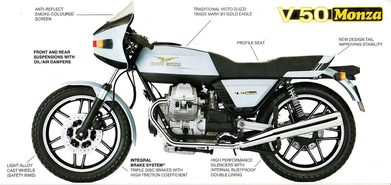There were several other changes to the overall design of the smaller engine and drivetrain. As it was designed to be produced in a variety of engine displacements, the helical primary gears lived in an intermediate housing between the engine and gearbox. The alloy swingarm pivoted on the rear of the five-speed gearbox in a manner similar to that of the 500cc V8 racer. The frame was similar to the big twins, with a detachable lower section, but with extremely skinny air-assisted forks and twin shock absorbers. There were triple integrated disc brakes in the usual Guzzi style. The angular styling and engine finning would eventually influence the larger twins and the overall result was a remarkably light and compact motorcycle. Not unexpectedly, sporting versions of both the V35 and V50 followed soon after their release in 1977. Styled along the lines of the Le Mans, with small fairing clip-on handlebars and rear-set footpegs, the V35 Imola and V50 Monza were both named after race tracks in Italy. The Monza had a considerably uprated engine over the regular V50. Retaining the engine dimensions of 75x57mm, there were larger valves and Dell’orto PHBH 28B carburettors that saw power increased to 48bhp at 7600rpm. The sizes of all the gearbox shafts, gears and bearings were increased to cope with the power, and there was dual points ignition and a duplex timing chain. While the V50 Monza provided significantly improved performance over the V50, it was still no match for the other sporting 500s appearing at that time. Where the V50 Monza really scored was in its weight and dimensions. With a 1420mm wheelbase and weighing only 160kg, the bike was tiny - especially compared to the comparable Honda CX500 "Plastic Maggot". The quest for more power culminated in the introduction of a four-valve cylinder head on the 650cc Lario of 1984, but the bike lost the fine looks and balance of the V50 Monza. Unfortunately the quest for cheaper manufacturing compromised the production quality of the smaller twins and the V50 Monza was largely forgotten. Providing an elegance and simplicity rare in the early 1980s, it never received the accolades it deserved despite offering a wonderful motorcycling experience away from the world of excessive weight and power. Source Bikepoint