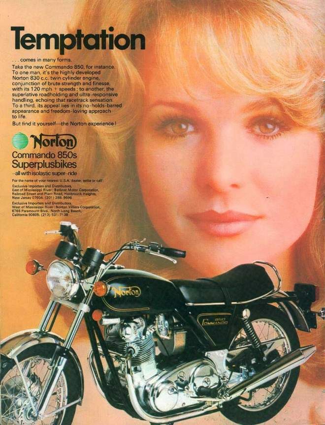 A few years back most English motorcycles enjoyed the reputation that you could ride all you liked but be sure to be home by night. The new Lucas electrics are as good as any system found on any current production bike. The headlamp throws a bright wide beam that allows for safe and fast nighttime touring. There is a new tail lamp assembly with a much larger lens which should be more than sufficient for good after-dark visibility. A Lucas alternator has the chore of supplying power for the entire system and seems to be up to the job. A rectifier and zenner diode complete the system. Incorporated into the system is a capacitor for dead battery starts or the battery can be totally removed and the system will function quite well without it. Starting is a bit more difficult but full lighting and ignition are possible without aid of the battery. Turn signals are fitted to the new model as standard equipment. They are located on stalks which are long enough to be seen by even the most myopic automobile driver. The only shortcoming in the whole set up is the rather ill defined Lucas handlebar switch. It is strange to note that Lucas parts are used throughout the entire electrical system until we get to the battery, which is inscribed with the words "Norton Villers, Made In Japan." There does not seem to be any sort of rejection problems because of the departure. The bike we tested was fitted with the superb Dunlop TT100 tires. They have got to be one of the best road tires made in the world today. They cling when leaned to the limits and from past experience their wear qualities should be the equal of anything available. All in all the new 850 Commando has the credentials of a fine high speed sport touring machine. By now you're asking: "What is it like to ride?" Our test machine was supplied by YBM Cycle Sales of Bryn Mawr, Pennsylvania and much of the credit for the bike's flawless performance must go to the attention given to the machine during set-up. Thanks, Don. My first thought on seeing this machine was "Boy, this one's going to be a bugger to start." I was fooled by the label on the side of the machine which proclaims its monstrous displacement. Starting proved to require some effort on the kick start pedal, but the machine proved very willing to fire on the first or second kick. Cold starting requires a simple drill of gas on, tickle the two 32mm Amal concentrics, turn on the key, crack the throttle and step through on the kick starter. The machine comes to life with a muted rumble. There is the realization that you are on a very large displacement machine by the mellow note. Norton Villers has fitted mutes to the standard silencers and have reduced the noise level to a minimum. These mutes can be removed but realize that you can ride with more gusto on a bike that does not attract attention. The 850 vibrates quite a bit at engine speeds below 3000 rpm, but this can be all but taken away by putting a preload on the top motor mounts. This is done merely by installing the proper thickness washer under the allen screws in the top mount. This will be done by the factory on later machines but for those of you who buy an early model, your Norton dealer should have the necessary information by the time this test is printed. Above 3000 rpm the vibration dispersed and the engine takes on the character of a multi as far as smoothness. This smoothness is due to the rubber mounting of the engine in the frame. Again we see better quality control at Andover, much more attention is being paid to proper shimming of the mounts than on earlier models. A good design made better by attention to detail. When one pulls in on the clutch one notices the light pull made possible by the use of a diaphragm type pressure plate. The clutch is effortless even after a full day of riding and at no time during the test did we find any tendency towards slip or drag even under the most severe use. As we pulled away, the reasoning behind the increased displacement became apparent. How much power do you want? The throttle is like a rheostat. It's all there right from an idle. Any gear, any rpm, there is no complaint from the English twin. In traffic it's as docile as a light weight. For its size it is the lightweight. At 430 pounds it is the lightest super-bike on the market. This lightweight pays off in spades when a quick change in trajectory is necessary. On the tight back roads of Chester County the Commando excels in the handling department, which is in keeping with Norton tradition. We did note a bit of a twitch in the front end when pushing to the limits over rough roads, but for inveterate scratchers, Norton Villers markets a hydraulic dampener developed on their highly successful Manx winning production racers. On the 850 the overall gearing has been raised by the use of a 21-tooth counter shaft sprocket in conjunction with a 42-tooth rear sprocket. Chain is Mark 10 Reynolds and it showed no need for adjustment during the entire test. Highway cruising is effortless on this machine and one must be careful not to exceed the posted speed limits on even the superhighways. The 850 would pull all the way to an indicated 125 mph with a little coaxing. At any speed the machine was smooth and stable. The springing is stiff but the machine did not feel uncomfortable on most roads. There were a few shortcomings. One of these was the seat. At first I thought it was just a problem with the material used in the padding of the saddle, but then discovered that the reason for the shortcoming was the seat is only about two inches thick over the main top tube of the frame, but on a sport machine this is something to be forgiven for the fine handling made possible by the frame design. We also found that it was impossible to find a comfortable position on the right footpeg because of the kick start lever. We finally solved this problem by folding out the pedal. The brakes on the Commando were excellent and very much in keeping with 