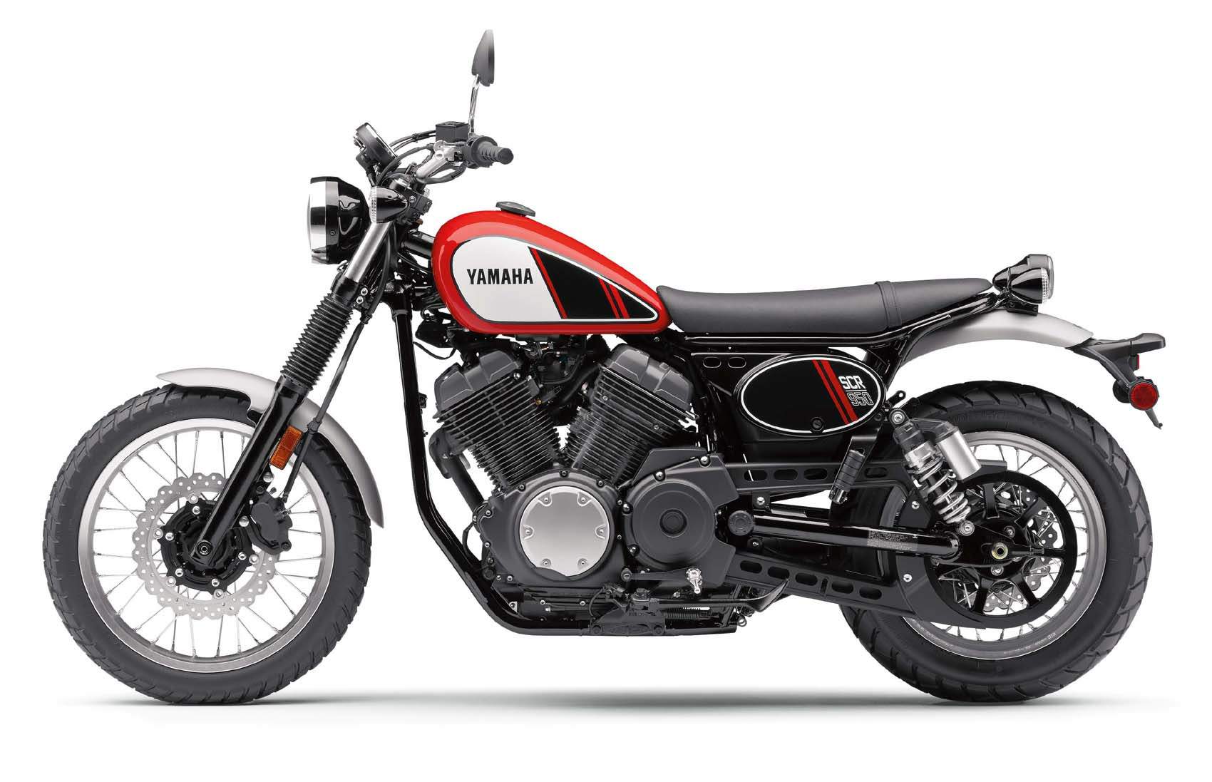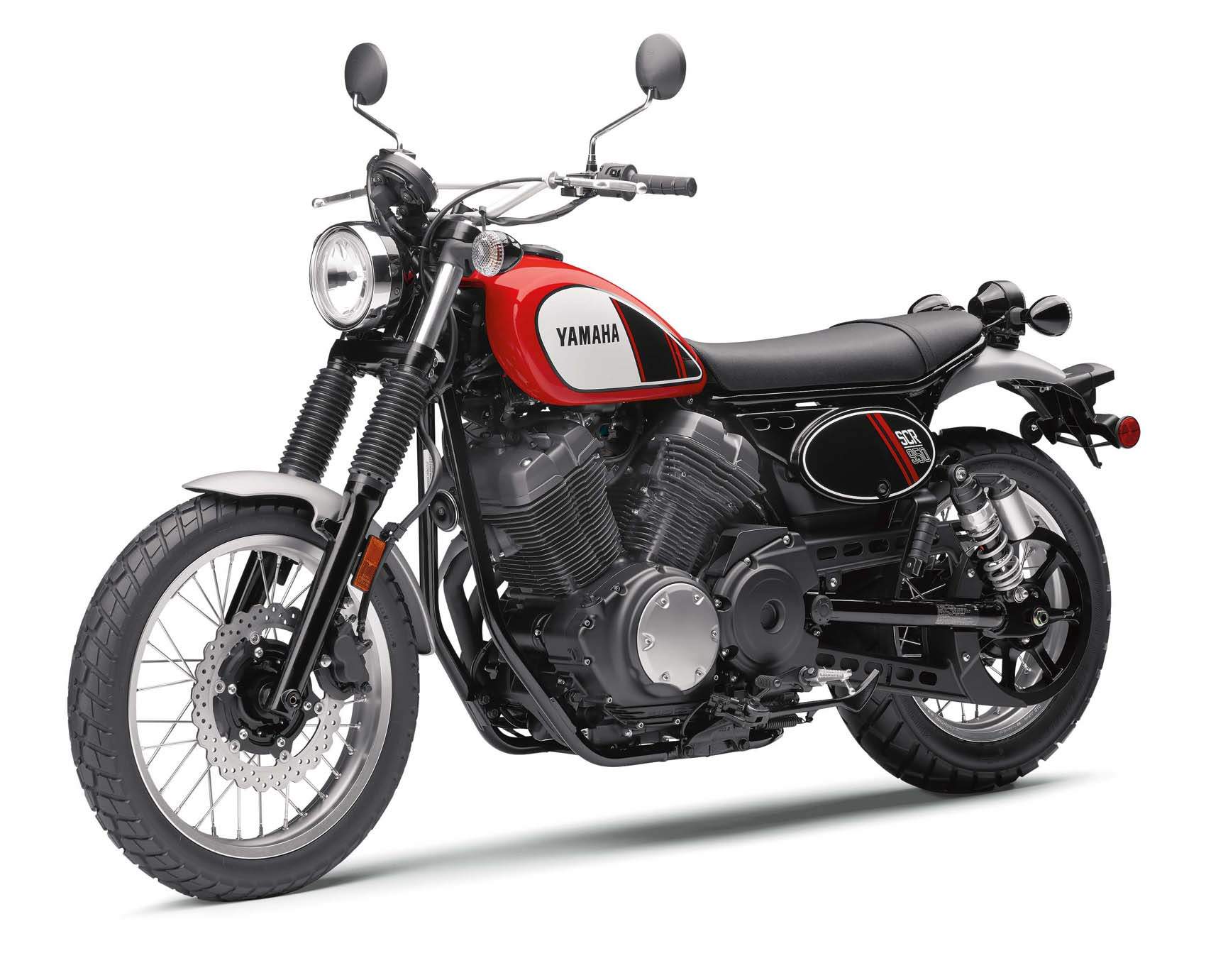 Yamaha introduced the 2017 SCR950, an all-new motorcycle that joins the company’s “Sport Heritage” model lineup, which already includes the VMAX, XSR900, and SR400. The SCR950 combines classic Yamaha styling, tracing its roots back to the iconic DT250, with modern components in a motorcycle that blurs the line between “cruiser” and “sportbike.” A tough explorer with scrambler styling, the SCR950 is powered by a 942cc (58-cubic-inch), air- cooled, 60° V-twin, fuel-injected engine with four valves per cylinder. The SCR950 hearkens back to the past with its wide and tall handlebars, retro-racing number-plate-styled side covers, fork gaiters, wire-spoked aluminum rims, 2-into-1 exhaust pipe with upswept muffler, and long low-profile seat. All that timeless style blends perfectly with modern engineering touches like an LCD speedometer, LED taillight, flangeless fuel tank, powerful brakes with wave-type rotors, and low-maintenance carbon-fiber-core belt final drive. The SCR950’s open and flexible riding position gives the rider confidence to handle whatever the road presents. The double-cradle frame features sporty geometry with centrally mounted footpegs for nimble, responsive handling. And the front and rear suspension systems are tuned to provide comfort and agility while contributing to the bike’s stylishly low profile. The SCR950 will be available in two distinctive colors: Charcoal Silver and Rapid Red. Each color scheme is complemented by racing-inspired red, white, and black graphics with bold, yet tasteful, accent stripes.