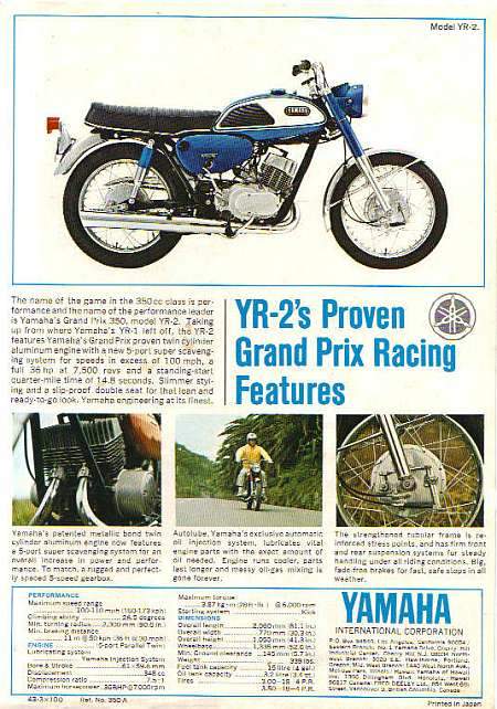 In 1967 Yamaha introduced a new model to their production line, known at the YR-1 Grand Prix. This motorcycle was the largest in the line that year, and represented a lot of firsts for Yamaha. It was the first 350cc motorcycle they had built. The engine was the first to use aluminum cylinders with cast iron sleeves, rather than all cast iron cylinders. It was the first to make use of horizontally split crank case, which made major engine work much easier. The engine was a twin cylinder, piston port, two stroke, five speed,